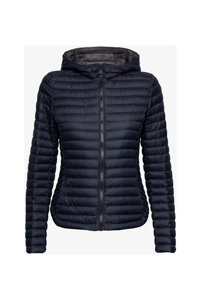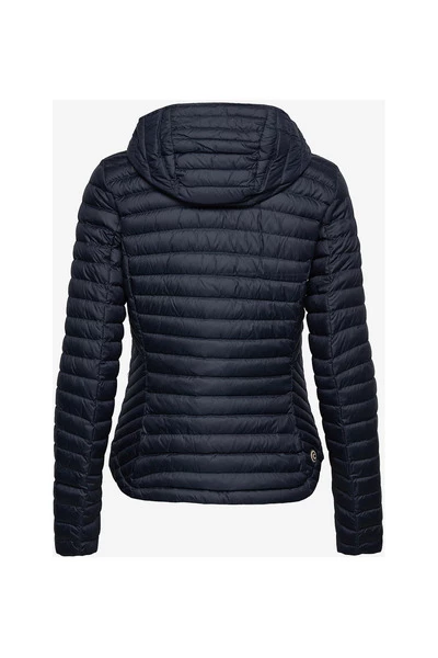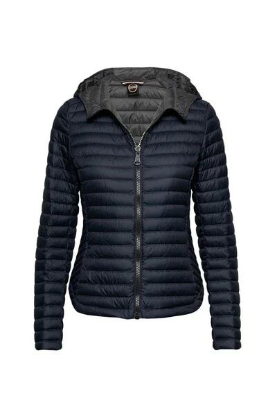 Licht donsjack met diagonale taillering van Colmar. Navy jack van waterafstotende behandeling met opstaande kraag, zwarte ritssluiting, twee zakken met ritssluiting op de borst en logobatch aangebracht op de linkermouw. Eén binnenzak.