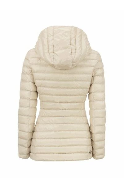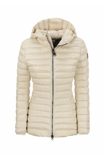 Vrouwenjas met vaste kap, gemaakt van waterafstotende iriserende stof en opgevuld met natuurlijke down. Een sportief maar vrouwelijk kledingstuk om het silhouet te verbeteren, zelfs in de winter.- Zip Sluiting