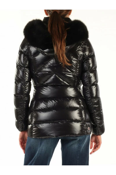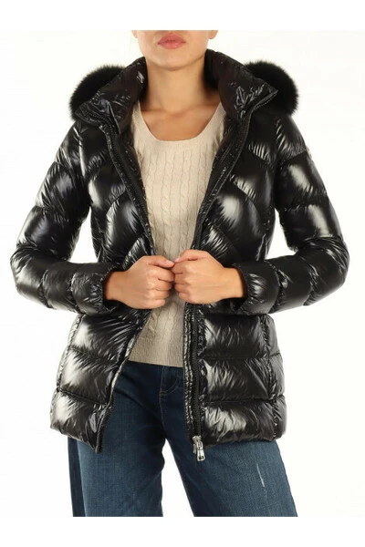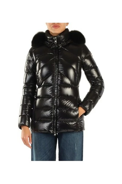 Gevoerde nylon stof en gewatteerde high cooded kraag afneembare kap in verwijderbare vacht lange mouwen met elastische manchetten met tweewegende ritssluiting en tiraziplefers voorzakken met ritssluitingslogo op het logo van de mouwpatch op de achterkussen: echte verenhoogte van het model ( cm): 175 grootte grootte: 40 Samenstelling: 100%polyamide