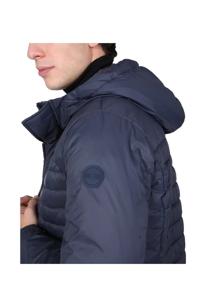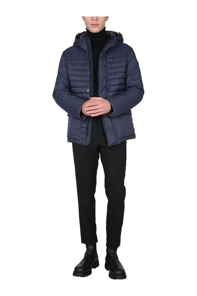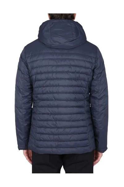Nek met capuchon, voor zip en snap -knoppen sluiting, logo -patch op de mouw, twee voorzakken, binnenzak, onbetrouwde binnenkant, model is 185 cm lang en draagt ​​maat 48 IT.
