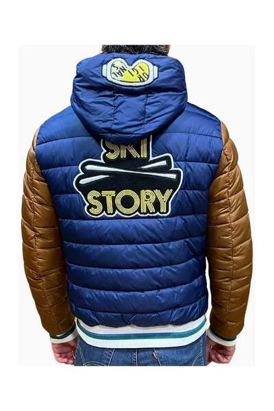 Mariene veren jas en bruine mouwen. 100 % polyamidesamenstelling. Patches ski -reden.