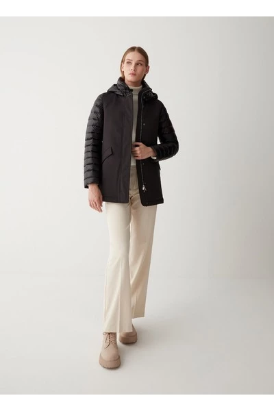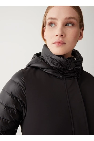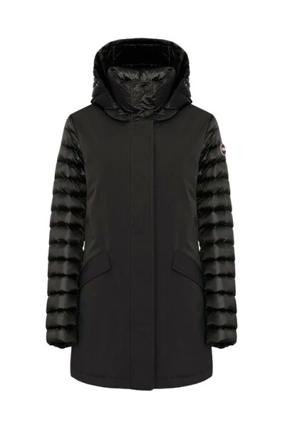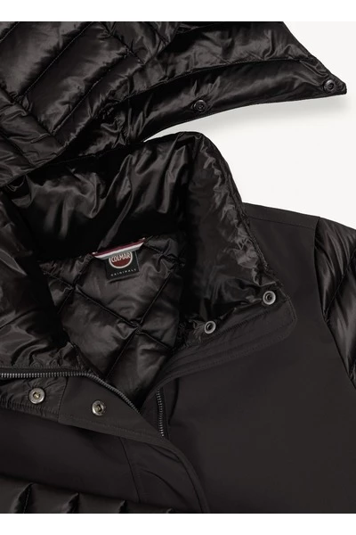 Middengerechte vrouwenjas met afneembare kap in drielaagse stretchstof, opgevuld met natuurlijke down. De afwisseling van gladde en gewatteerde onderdelen geeft gruis aan dit model met technische inhoud gemengd met charmante details. Sluiting met zip en perszakken met zip en pers met personderdelen afneembare motorkap natuurlijke veervulling stof ondoordringbaarheid: 10.000 mm waterkolom Water-repellente behandeling Colmar Originals Logo toegepast op de linkerkleef