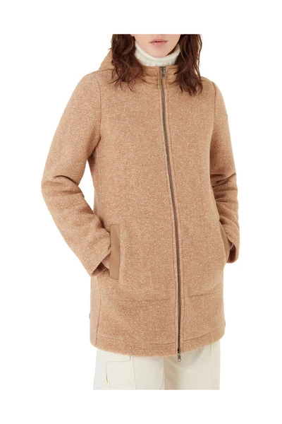 Middenlengte vrouwen ; s capuchon jas gemaakt van warm wollen blend doek met neopreen-effect erin. Het patroon van deze stof gecombineerd met nylon voor de kap en zakken is zeer vrouwelijk. De schone versie van de Duffle Coat, een altijd groen dat iedereen ontmoet ; s smaakt. Onbevorderd winterkleding. Zip sluiting zakken zakken met een vaste kap op de kap op de motorkap