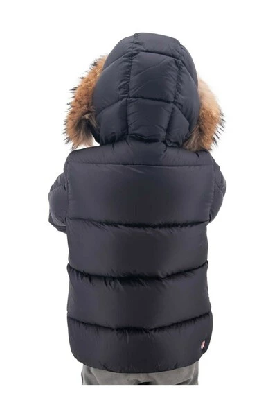 Junk naar beneden in vrijstaande vacht gewatteerd met logo op de schouder en hoofd taillezakken bij voorkeur bruikbaar in de winter gemaakt in China Samenstelling 93% Duck Feathers 7% Feather – 100% bont