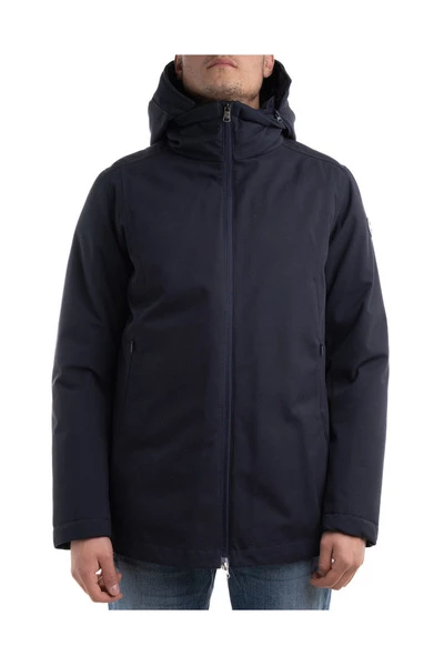 Gemiddelde lengte model met mandarijnkraag, kap met verstelbare en verwijderbare trekstring, gesloten met dubbele schuifjes rits, zijzakken gesloten met verborgen rits, binnenzak gesloten met rits, reguliere pasvorm; Minimale maar praktische lookbrand aangebracht op linker mouw